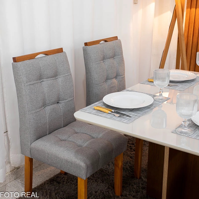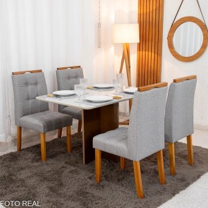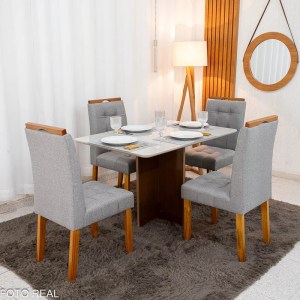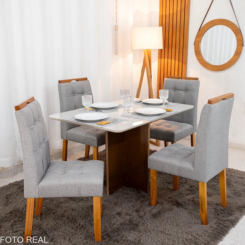 Mesa de Jantar Matheus 120×80 Vidro Off/Base Cinamomo + 4 Cad. Londres Linho Cinza Madeira #MKR