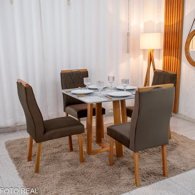 Mesa de Jantar Penelope 90×90 Vidro Off/Base Madeira + 4 Cad. Lisboa Veludo Marrom 509 Madeira #MKR